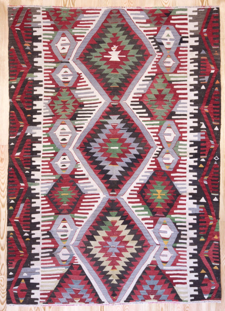 5x8 Vintage Anatolian Turkish Kilim Area Rug | Interlocked vibrant geometric tribal symbols | SKU 408