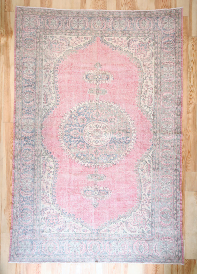 7x10 Vintage Central Anatolian Oushak Style Turkish Area Rug | Bold medallion spacious field floral border | SKU 496