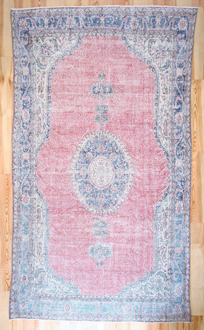 6x10 Vintage Central Anatolian Oushak Style Turkish Area Rug | Bold medallion spacious field floral border | SKU 511