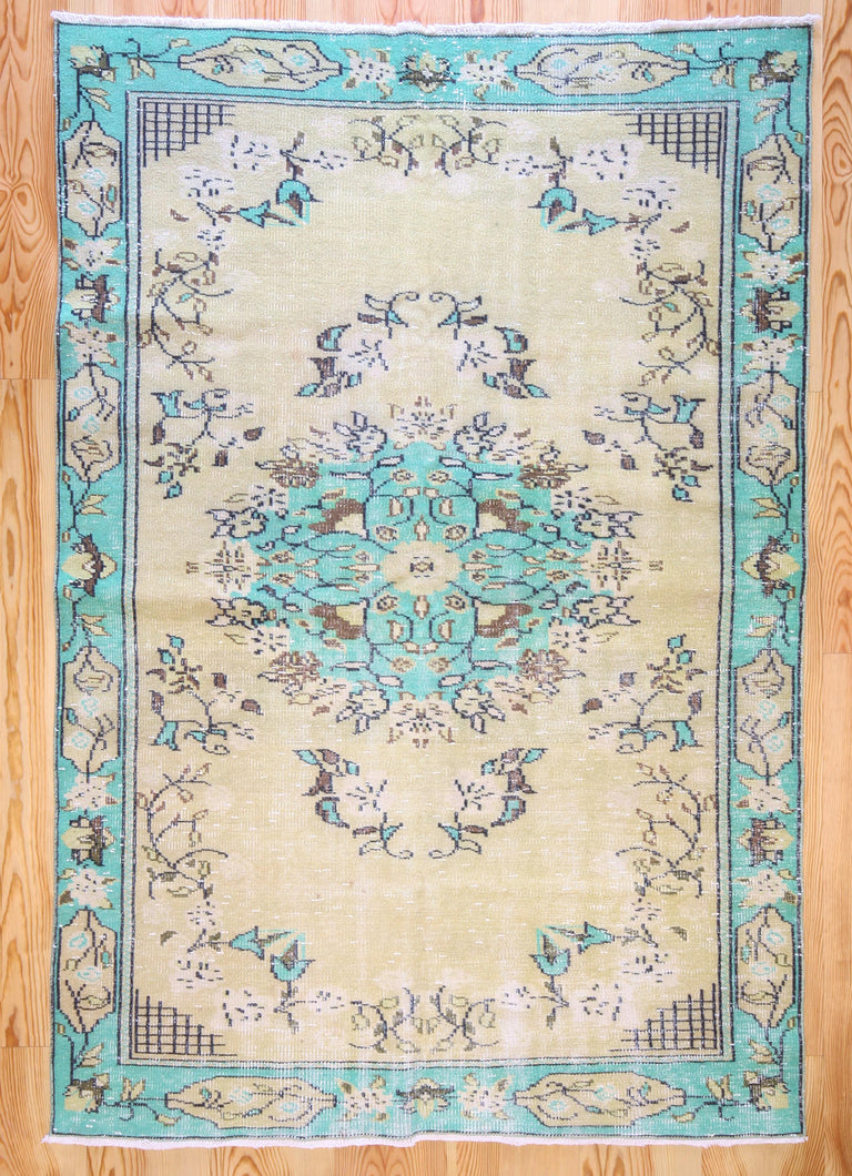 5x8 Vintage Central Anatolian Oushak Style Turkish Area Rug | Bold turquoise medallion and border chartreuse field | SKU 508