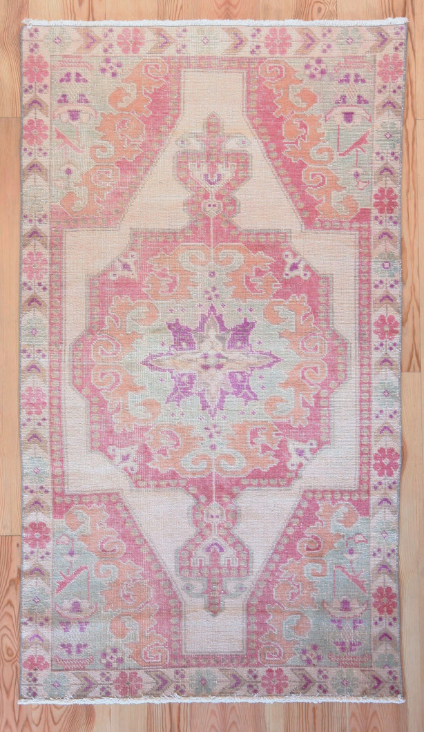 4x11 Vintage South Eastern Anatolian Oushak Style Turkish Area Rug | Geometric Design Pops of Pink | SKU 504