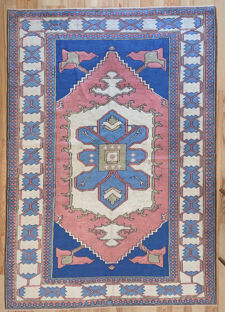 6x10 Vintage Central Anatolian 'Aksaray' Turkish Area Rug | Geometric Medallion Spacious Blue Field Geometric Border | SKU 619