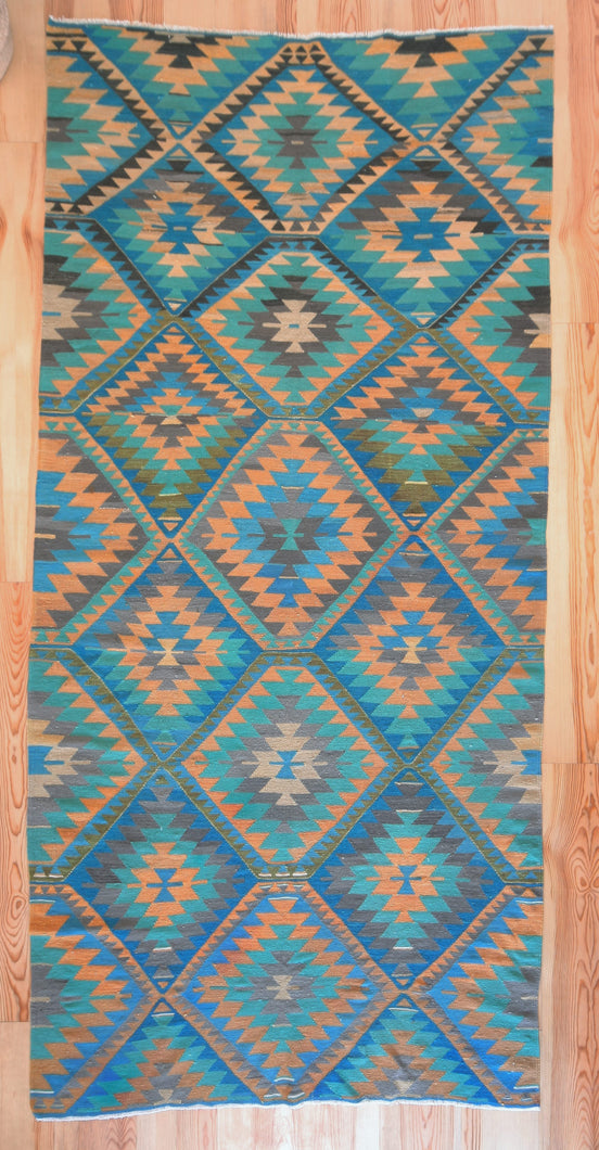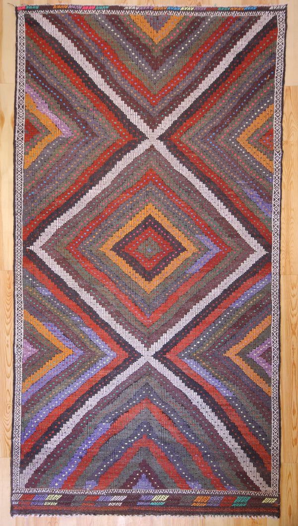 5x11 Vintage Anatolian Turkish Kilim Area Rug | Repeating staggered tribal diamond design vibrant colors | SKU 520