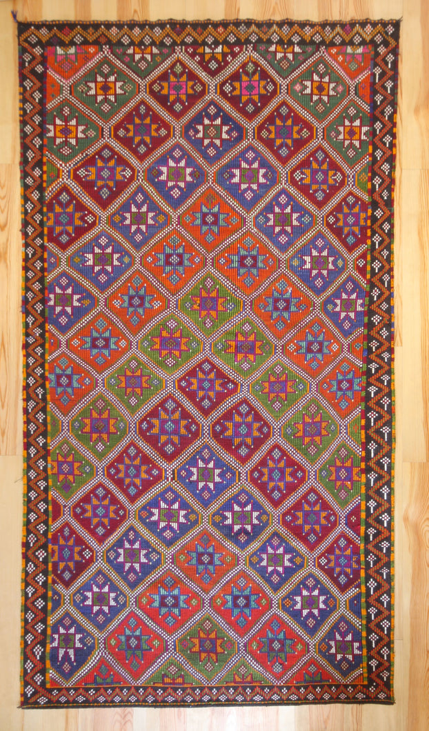 6x9 Vintage Anatolian Turkish Kilim Area Rug | Repeating staggered all over tribal motifs with stars in centers | SKU 535