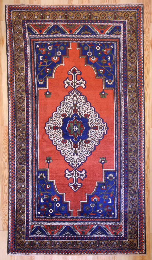6x11 Vintage Central Anatolian 'Taspinar' Turkish Area Rug Bold Medallion Spacious Field Floral Corner Brackets Geometric Border | SKU 548