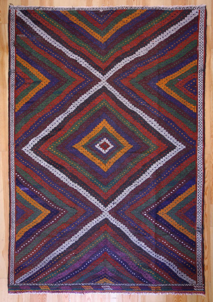 7x12 Vintage Western Anatolian Turkish Kilim Area Rug Colorful Symmetrical Diamond Design with Alternating Colors | SKU 557